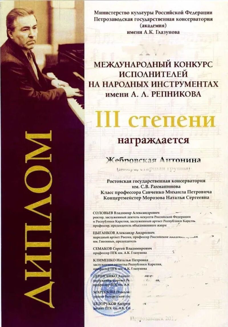 - Конкурс исполнителей на народных инструментах, лауреат 3 степени, 2013 г.