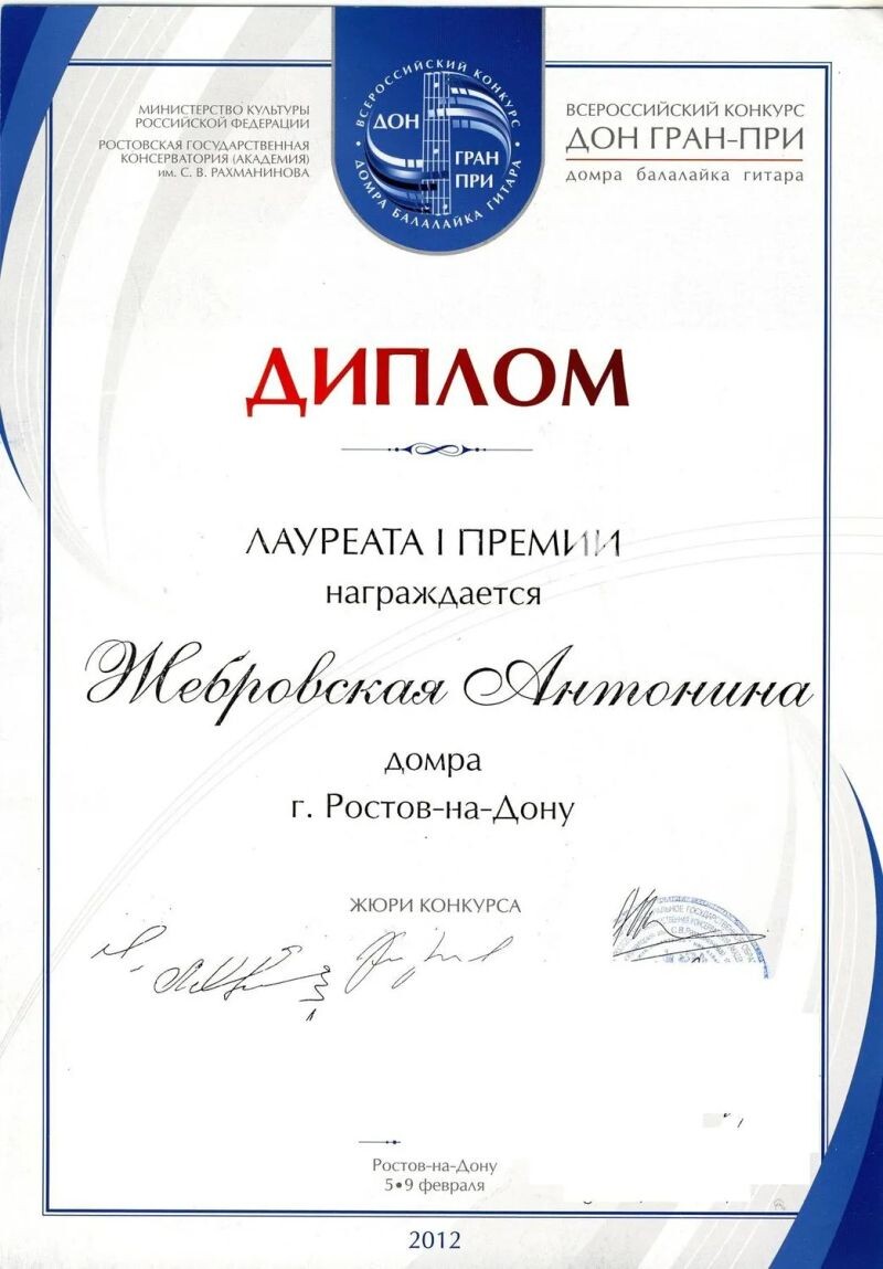 - Дон Гран-при, лауреат 1 степени, домра, 2012 г.
