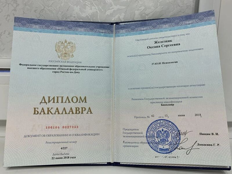 - ФГАОУ ВО «Южный федеральный университет», психология, бакалавр, г. Ростов-на-Дону, 2018 г.