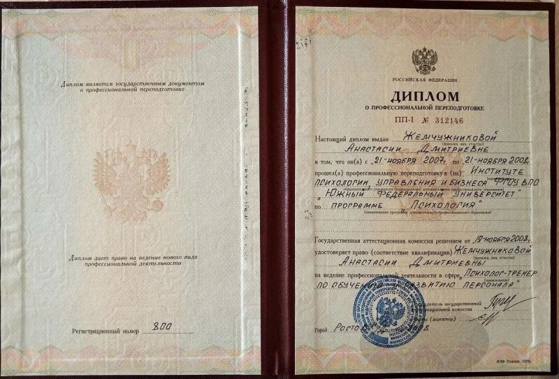 - Южный федеральный университет, психология, психолог-бизнес-тренер, 2007–2008 гг.