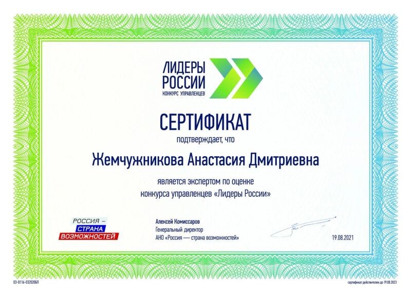 - АНО «Россия — Страна возможностей», эксперт по оценке конкурса управленцев «Лидеры России», 2021 г.