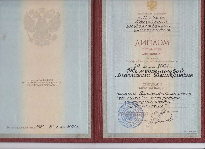 - Адыгейский государственный университет, филолог, преподаватель русского языка и литературы по специальности «Филология», 1996–2001 гг.