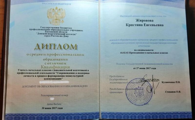 - ГБПОУ Ростовской области «Донской педагогический колледж», преподавание в начальных классах, 2013–2017 гг.