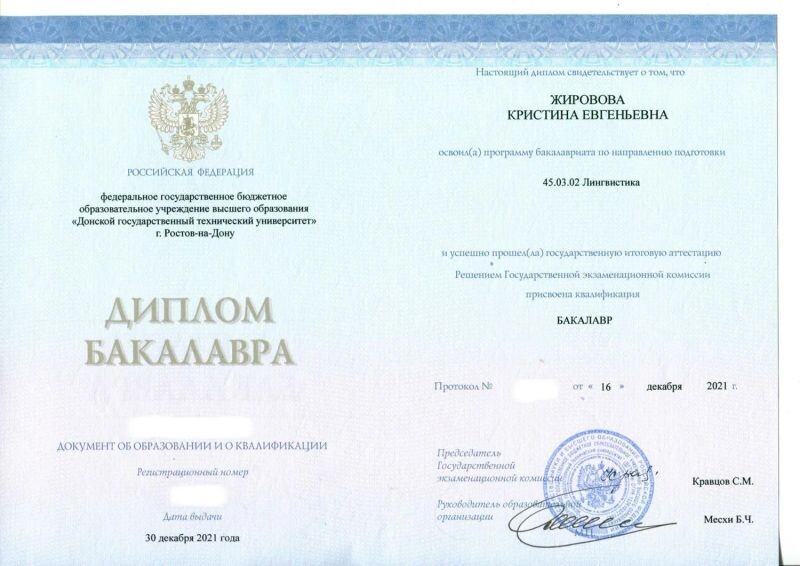 - Донской государственный технический университет, специальность –лингвистика, 2017–2021 гг.
