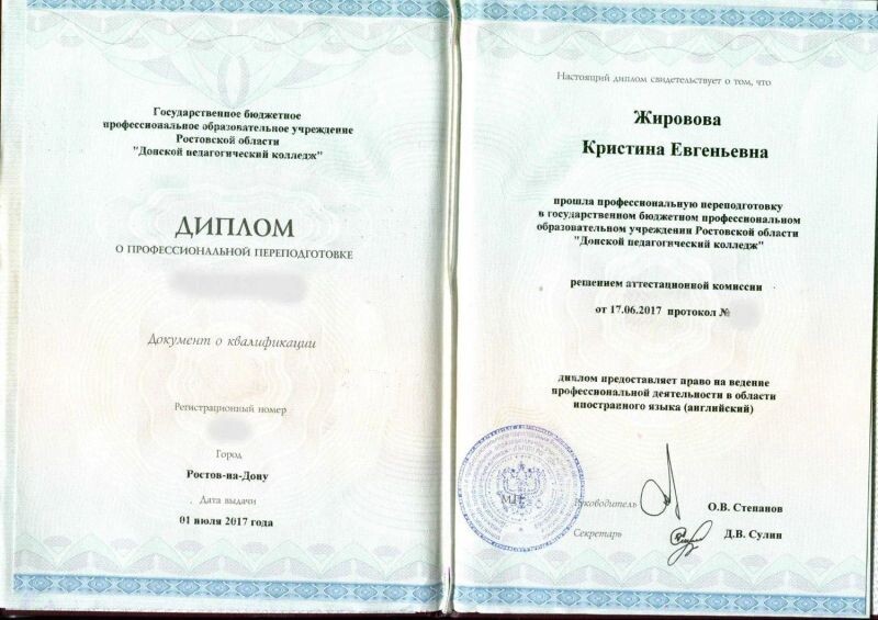 - ГБПОУ Ростовской области «Донской педагогический колледж», преподавание английского языка в образовательных учреждениях, 2013–2017 гг.