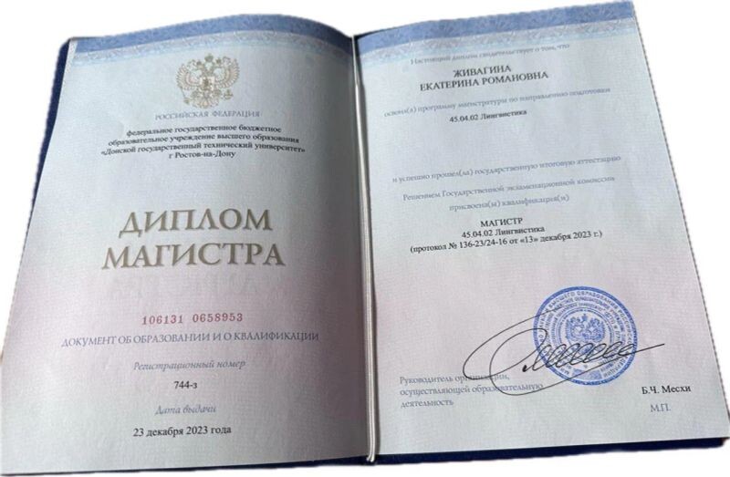 - ФГБОУ ВО «Донской государственный технический университет», диплом магистра по направлению «Лингвистика», 2021–2023 гг.