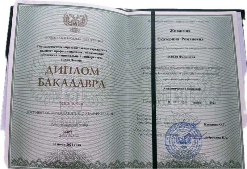 - ГОУ ВПО «Донецкий национальный университет», диплом бакалавра по направлению «Филология», 2017–2021 гг.