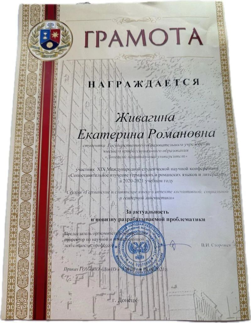 - ГОУ ВПО «Донецкий государственный университет», участие в конференции «Сопоставительное изучение германских и романских языков и литератур», 2021 г.