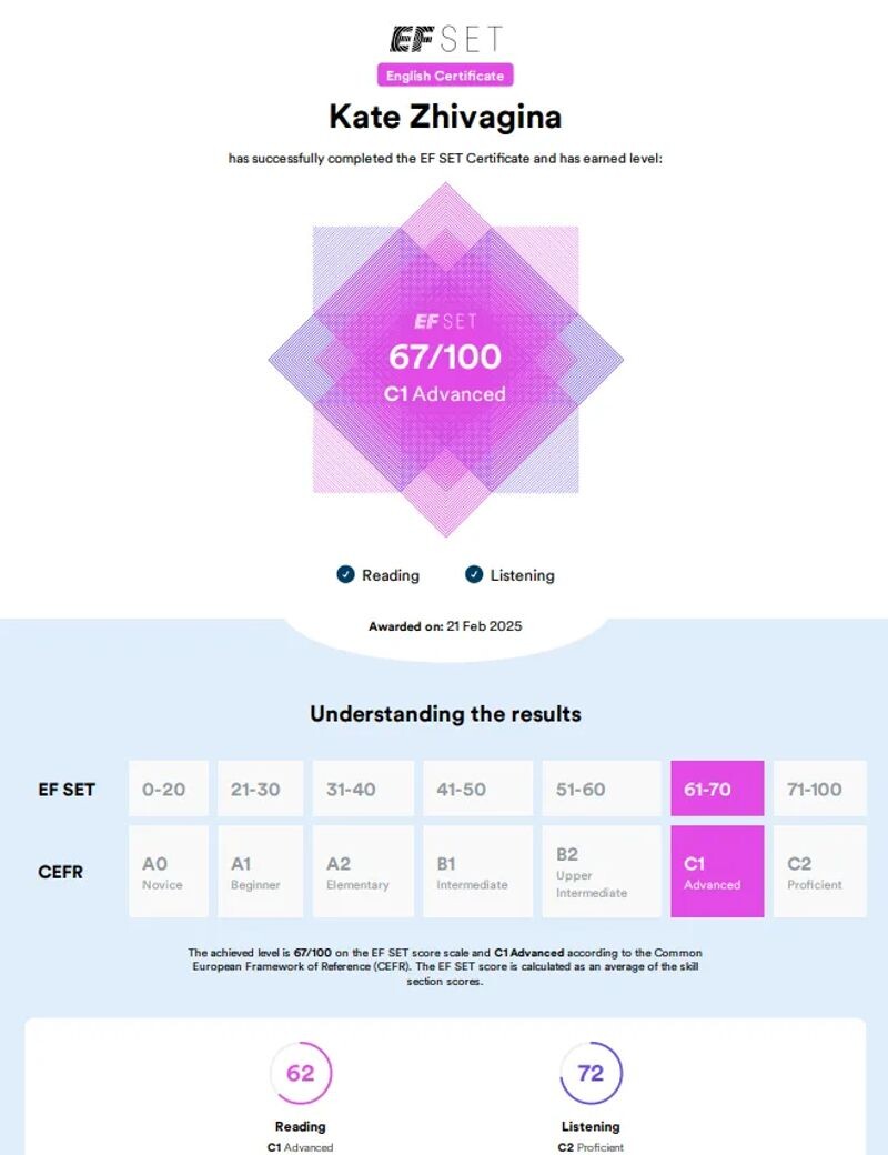- Онлайн школа «Lingvo studio», преподаватель английского и испанского языков, 2021–2022 гг.