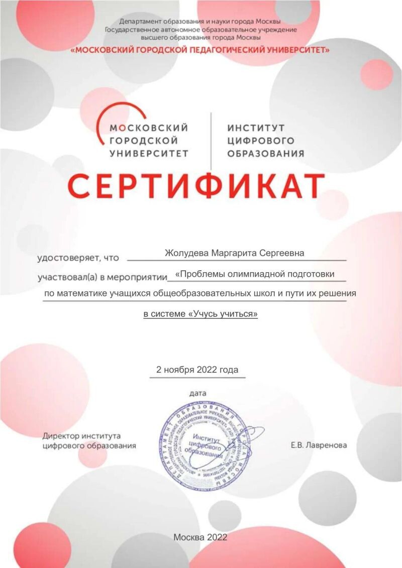- Московский городской педагогический университет, участвовала в мероприятии «Проблемы олимпиадной подготовки учащихся и пути их решения в системе «Учусь учиться», 2022 г.
