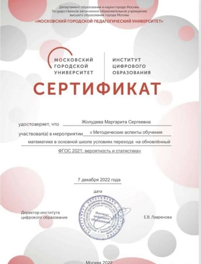 - Московский городской педагогический университет, участвовала в мероприятии «Методические аспекты обучения математике в основной школе условиях перехода на обновленный ФГОС 2021: вероятность и статистика», 2022 г.