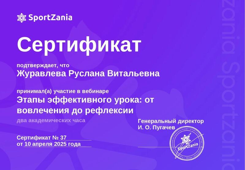 - SportZania, вебинар «Этапы эффективного урока: от вовлечения до рефлексии», 2024–2025 гг.