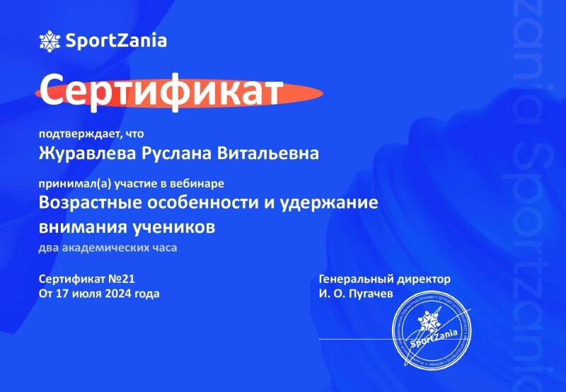 - SportZania, вебинар «Возрастные особенности и удержание внимания учеников», 2024 г.