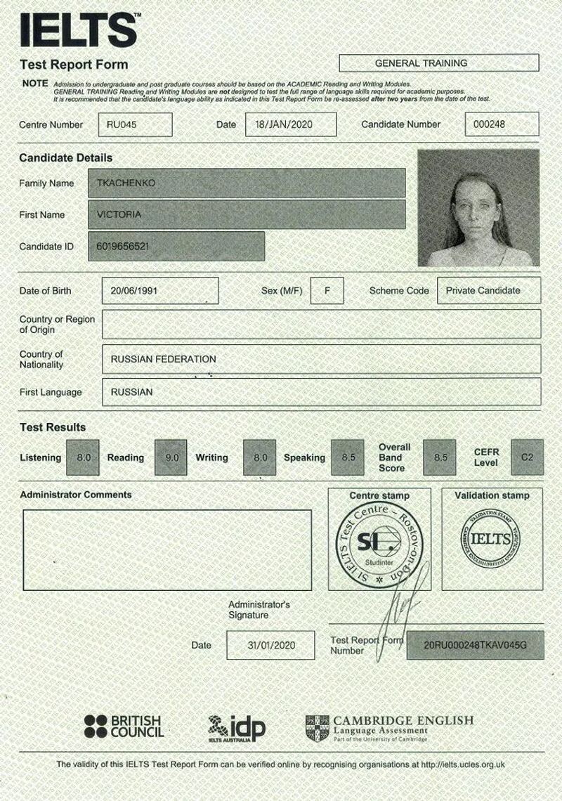 - IELTS General, уровень C2 по международной шкале CEFR, 2020 г.