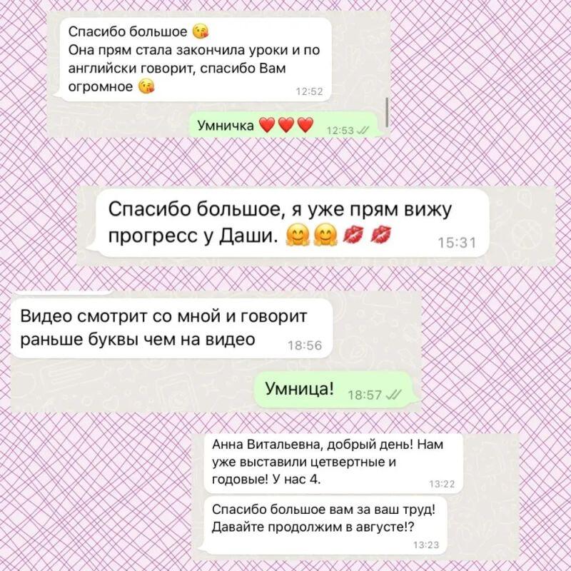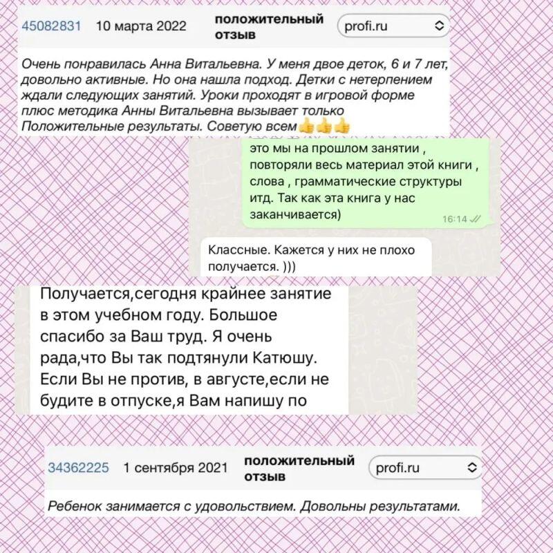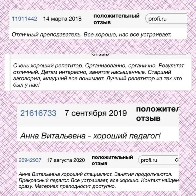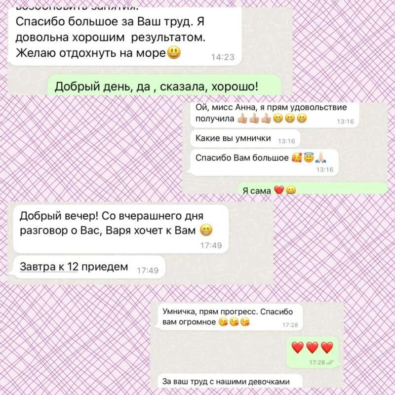 Я просто хотела поблагодарить Анну Витальевну за ее профессионализм и очарование! Мой ребенок всегда с радостью занимается с ней (а это действительно сложно найти подход к ребенку). Мы легко договорились о расписании занятий и программе обучения!🌹