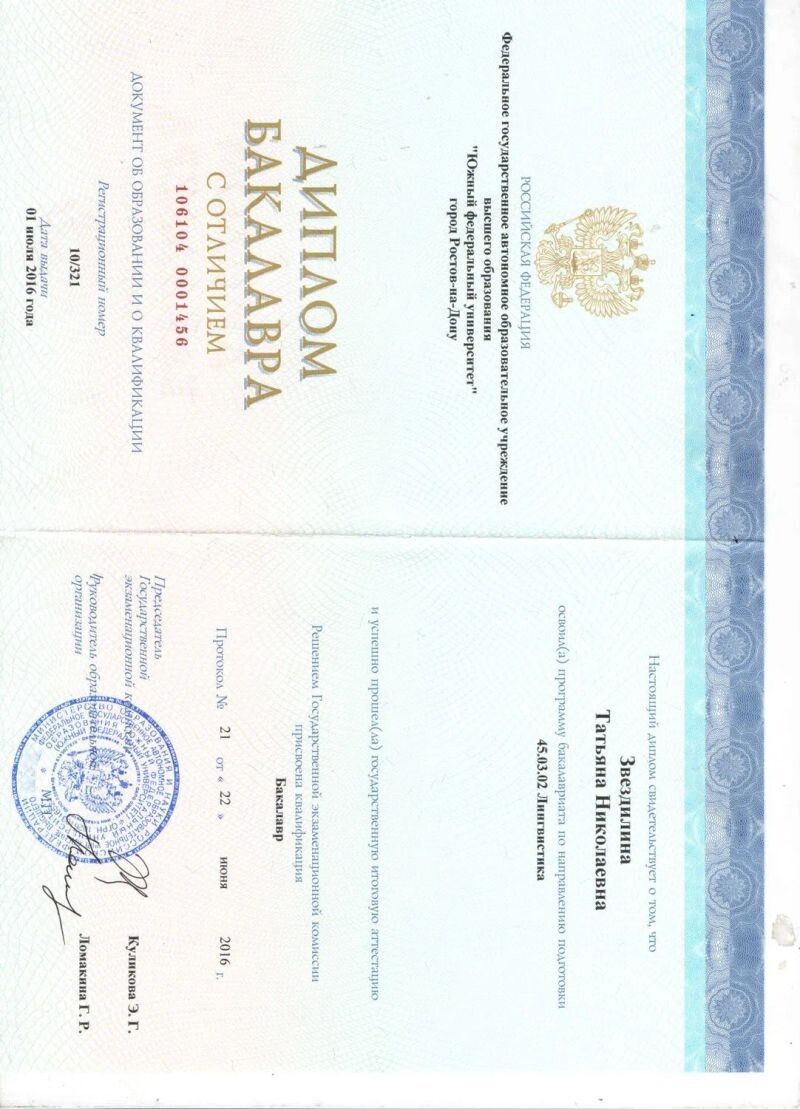 - Южный федеральный университет, Институт филологии, журналистики и межкультурной коммуникации, направление «Лингвистика», диплом бакалавра с отличием, 2016 г.