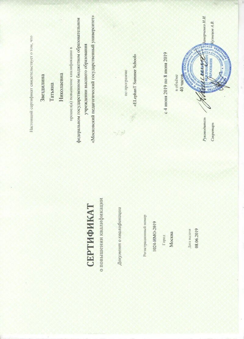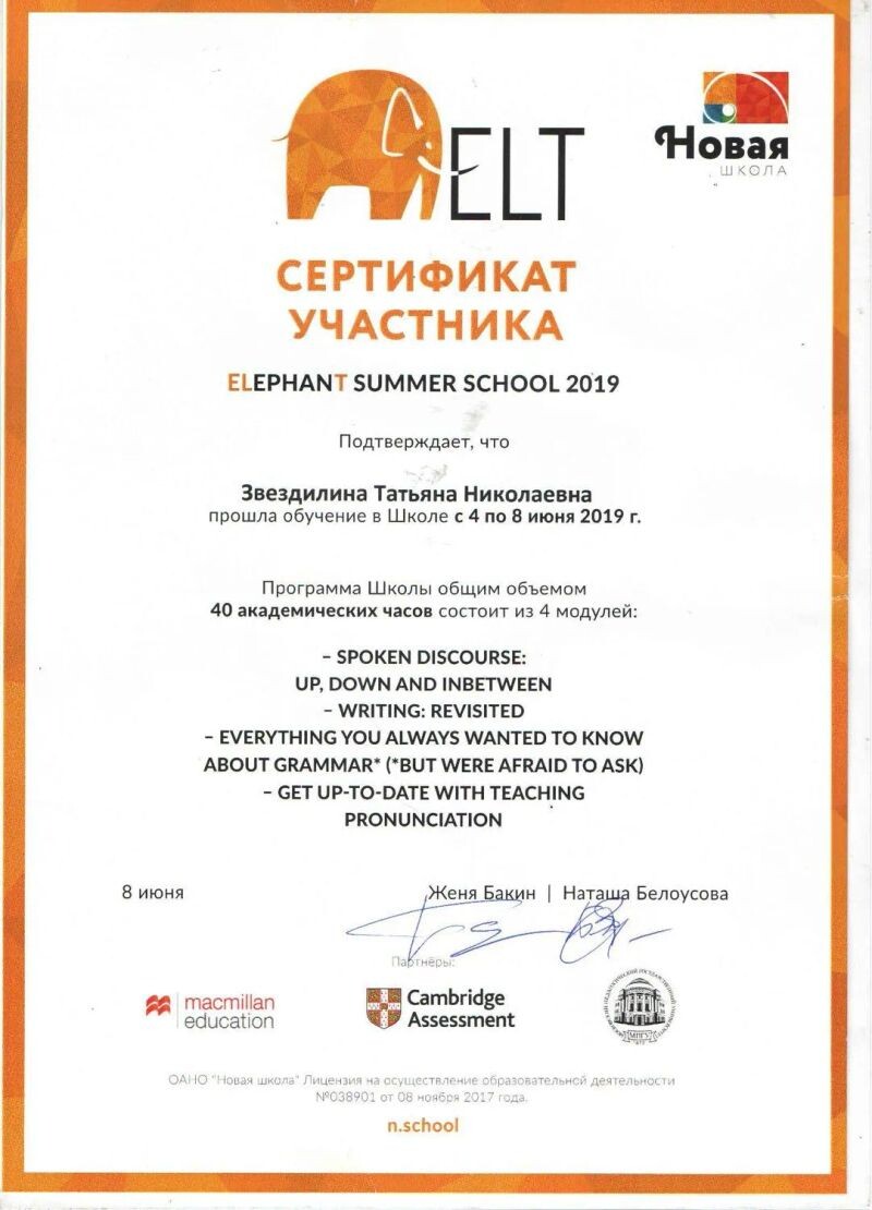 - Прохождение летнего курса для преподавателей английского языка ELephanT School при высшей школе экономики, 2019 г.