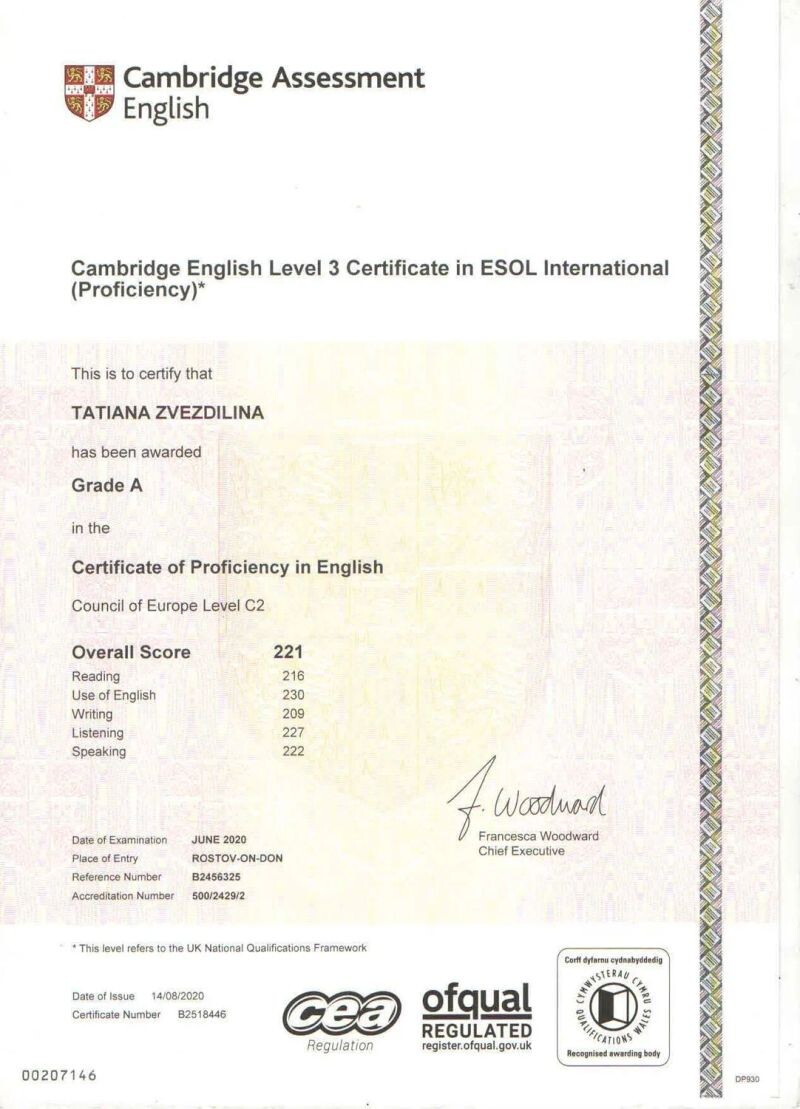 - Кембриджский сертификат Proficiency (Grade A), 2020 г.