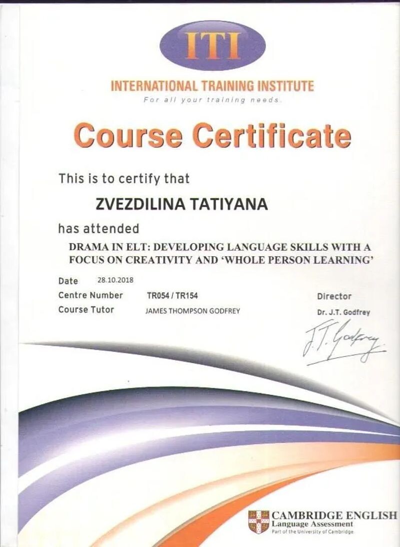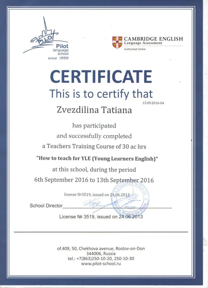 - Языковая школа «Пилот», курс подготовки преподавателей How to Teach for YLE (Young Learners English), 2016 г.