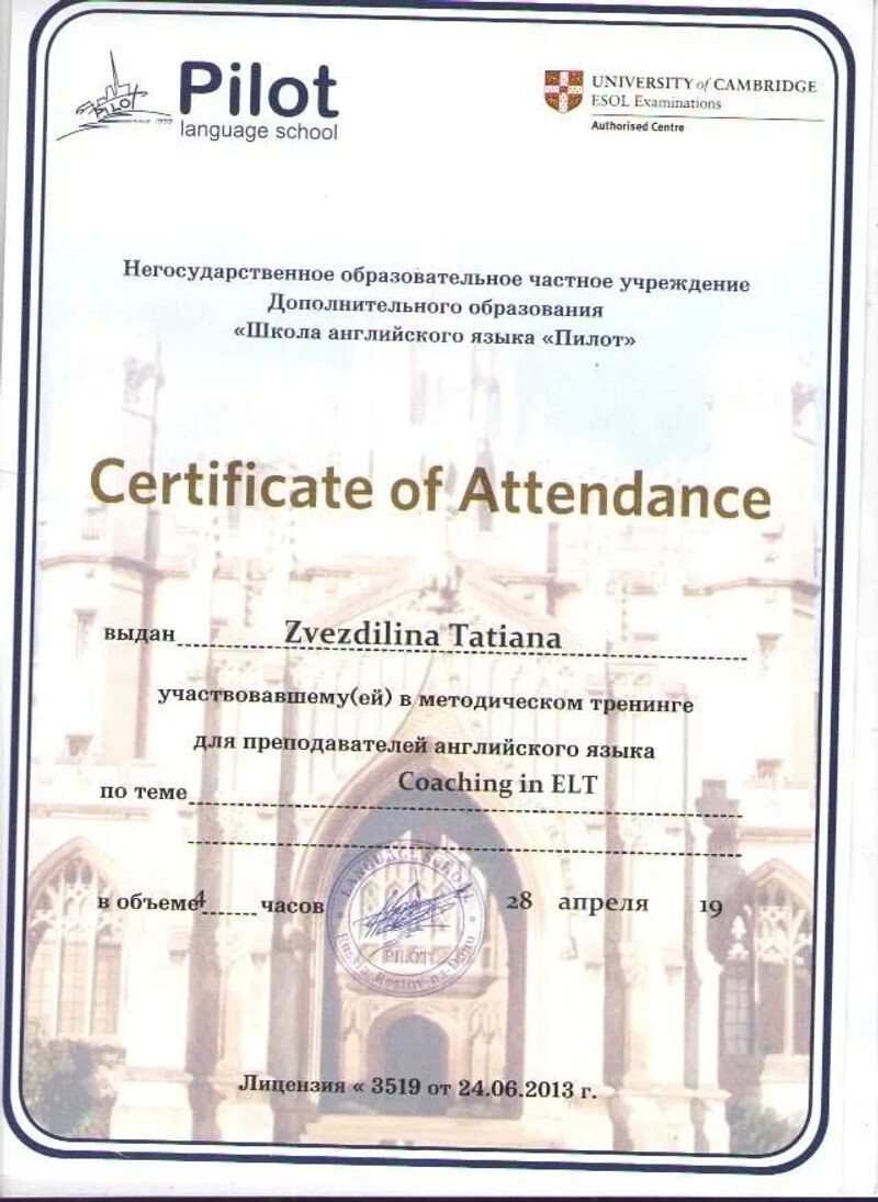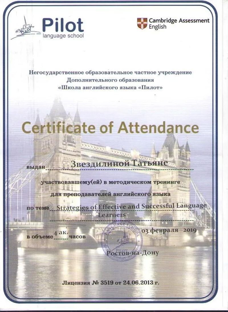- Школа Pilot, прохождение семинара для преподавателей по английскому языку, 2019 г.