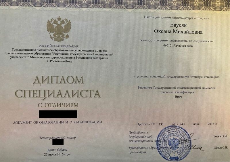- РостГМУ, лечебное дело, квалификация «врач», 2010–2016 гг.