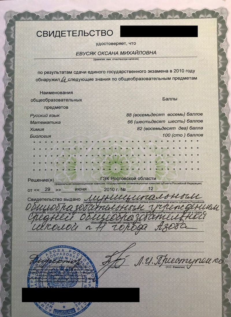 - Свидетельство о сдаче ЕГЭ по биологии на 100 баллов, 2010 г.