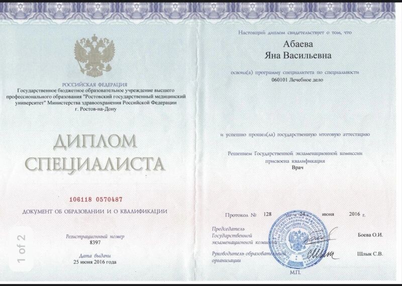 - Ростовский государственный медицинский университет, лечебное дело, 2016 г.