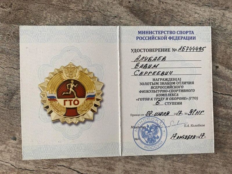 - Золотой знак отличия всероссийского физкультурно-спортивного комплекса «Готов к труду и обороне», (ГТО) 6 ступень, 2017 г.