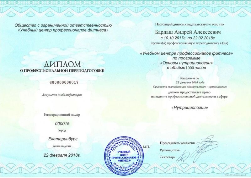 - Учебный центр профессионалов фитнеса, основы нутрициологии, 2018 г.