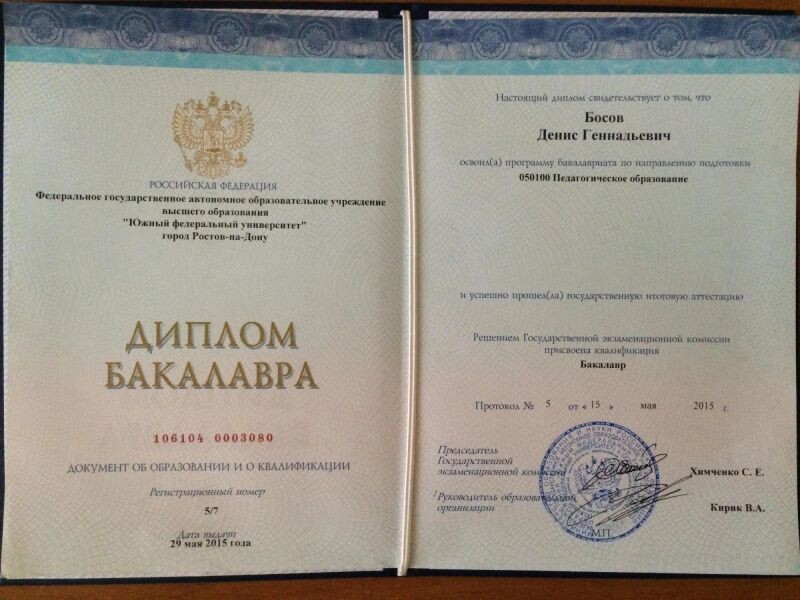 - Южный федеральный университет, направление – педагогическое образование, 2011–2015 гг.