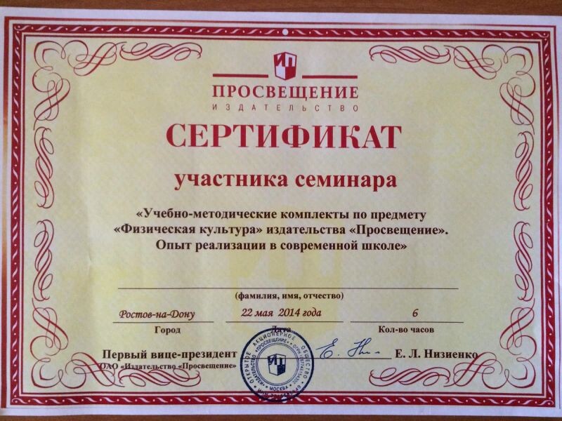 - Издательство «Просвещение», семинар «Учебно-методические комплекты по физической культуре. Опыт реализации в современной школе», 2014 г.