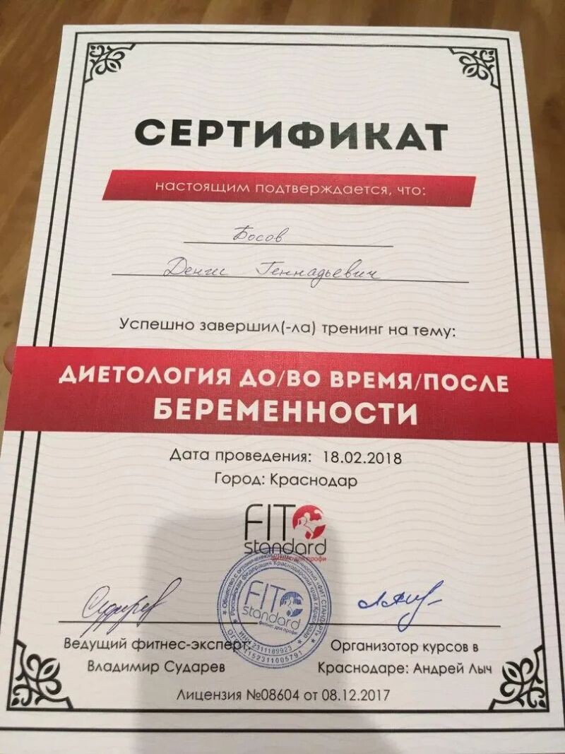 - Fit Standart, курс «Диетология до / во время / после беременности», 2018 г.