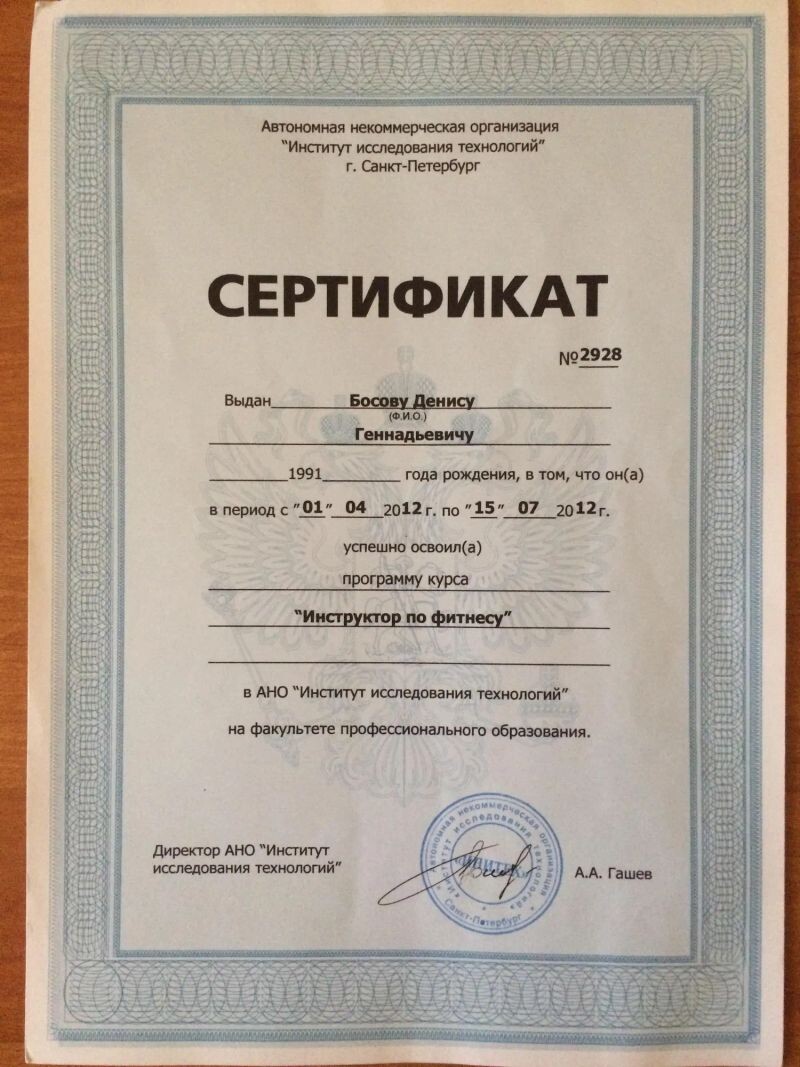 - Институт исследования технологий, г. Санкт-Петербург, инструктор по фитнесу, 2012 г.