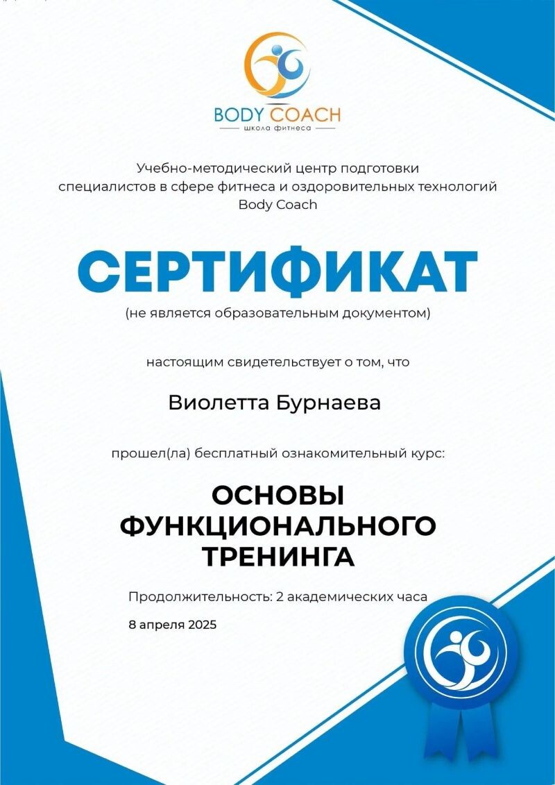 - Сертификат «Основы функционального тренинга» (с 2025 г.).