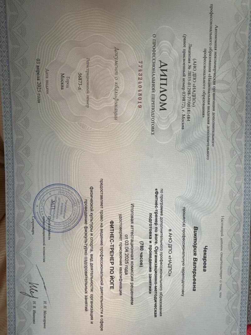 - АНО ДПО «НАДПО», программа «Фитнес-тренер по йоге. Организационно-методическая подготовка и проведение занятии», 2024–2025 гг.