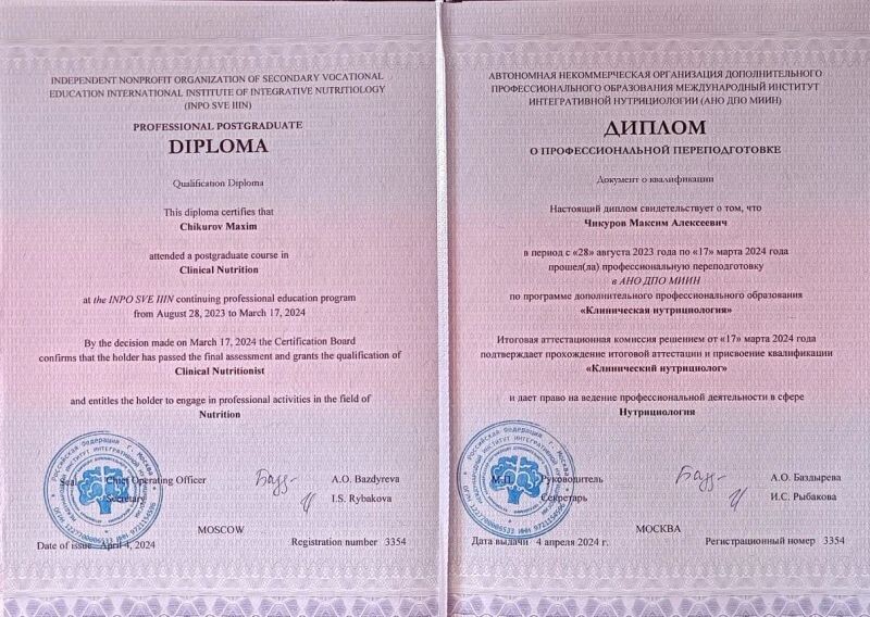 - Международный институт интегративной нутрициологии (МИИН) Клинический нутрициолог, 2023–2024 гг.