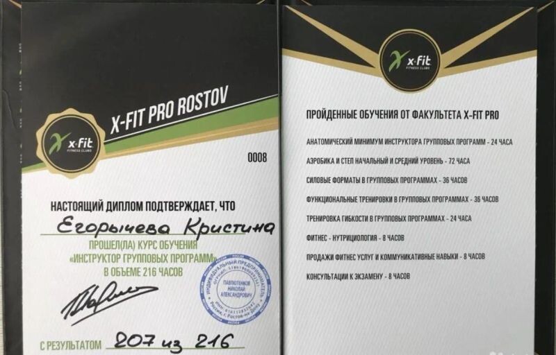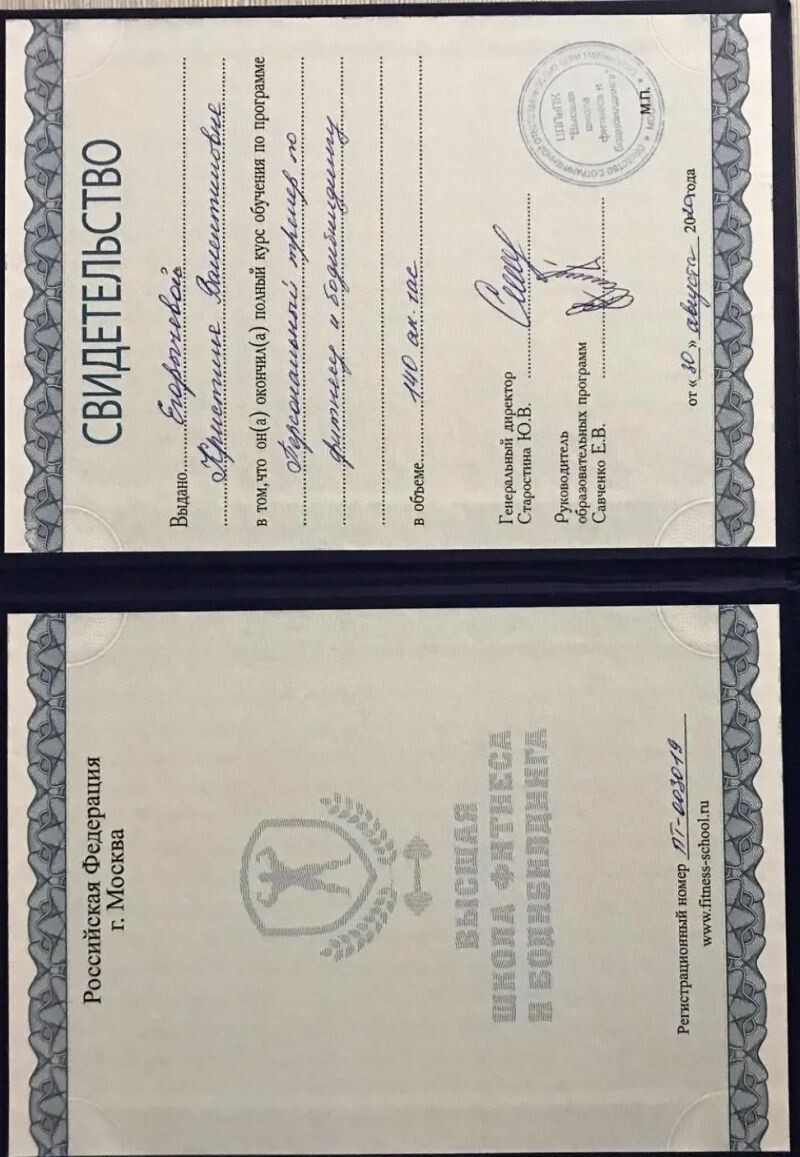 - Высшая школа фитнеса и бодибилдинга, программа «Персональный тренер по фитнесу и бодибилдингу», 2020 г.