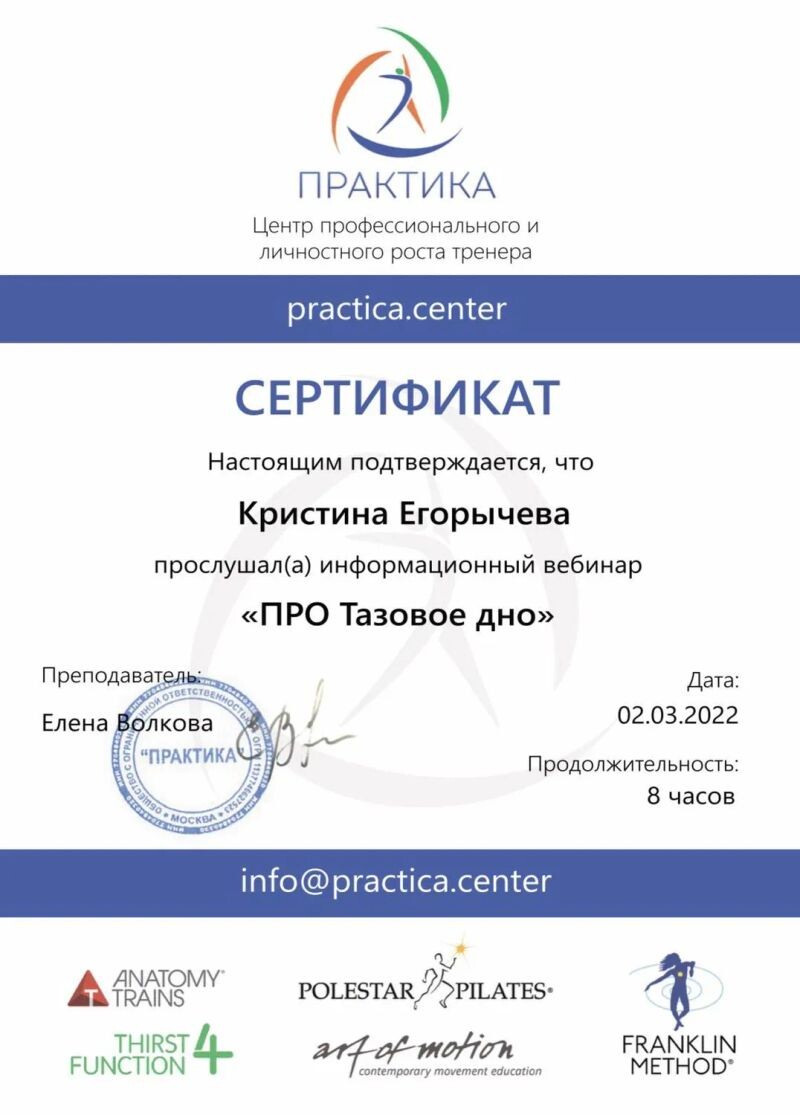- Центр профессионального и личностного роста тренера «ПРАКТИКА», курс «ПРО тазовое дно», 2022 г.
