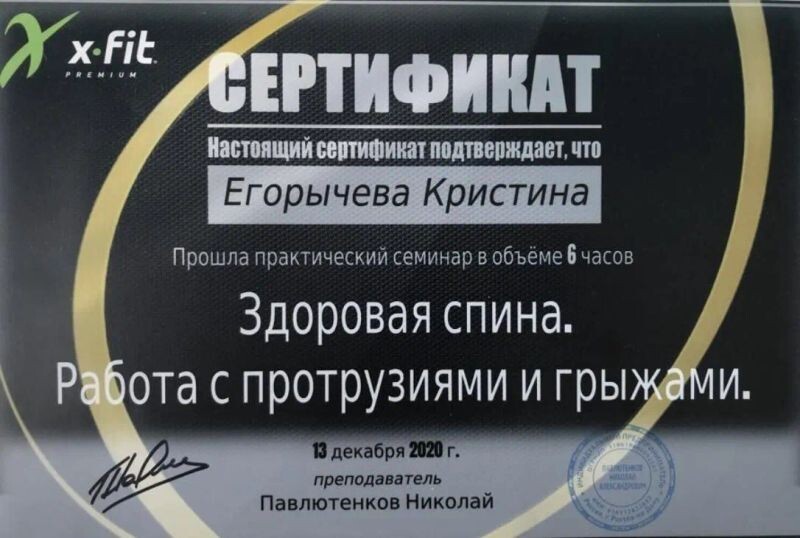- X-fit premium, семинар «Здоровая спина. Работа с протрузиями и грыжами», 2020 г.