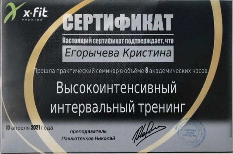 - X-fit premium, курс «Высокоинтенсивный интервальный тренинг», 2021 г.