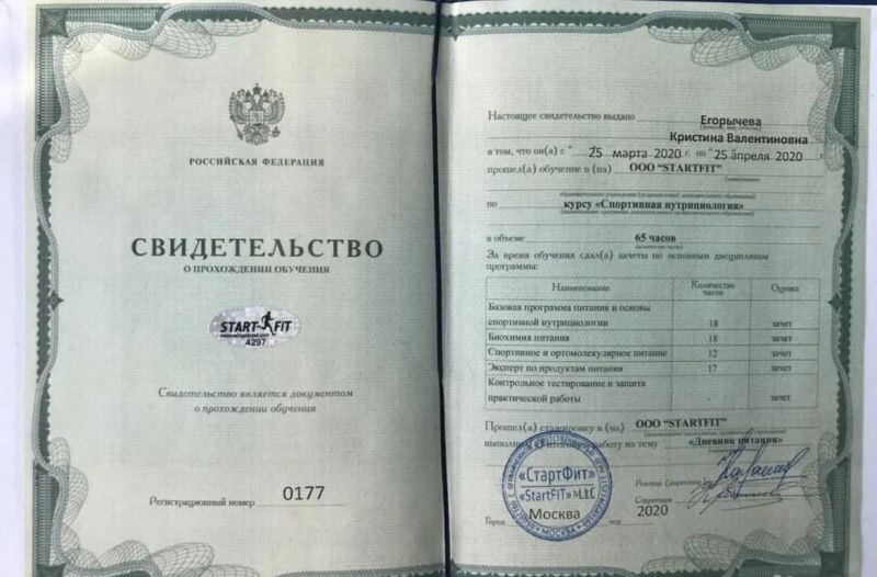 - ООО StartFit, курс «Спортивная нутрициология», 2020 г.
