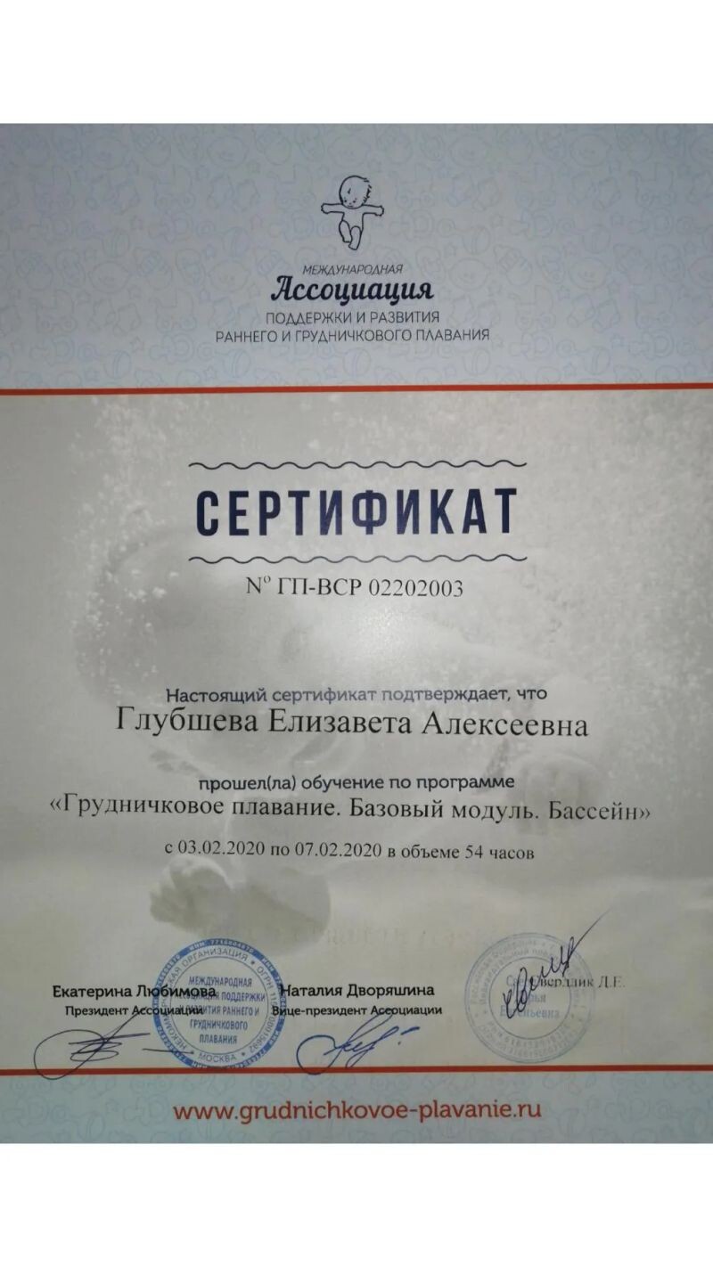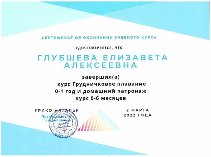 - Авторский курс «Грудничковое плавание 0-1 год и домашний патронаж 0-6 месяцев», 2022 г.