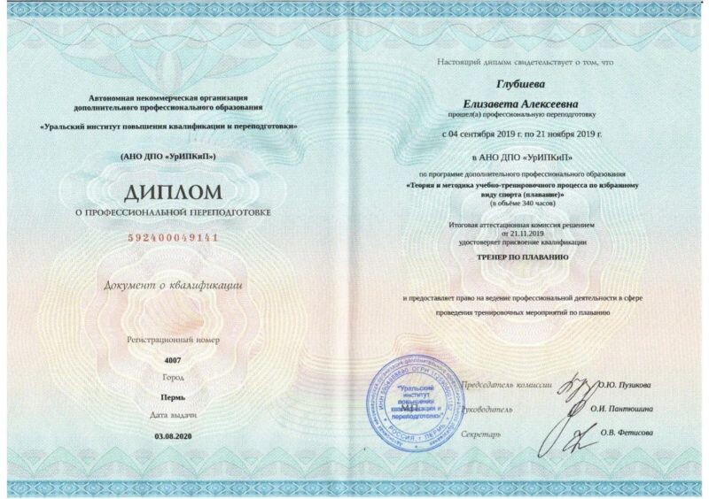 - АНО ДПО «УрИПКиП», тренер по плаванию, 2019 г.