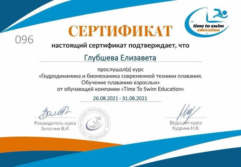 - Time To Swim Education, курс «Гидродинамика и биомеханика современной техники плавания. Обучение плаванию взрослых», 2021 г.