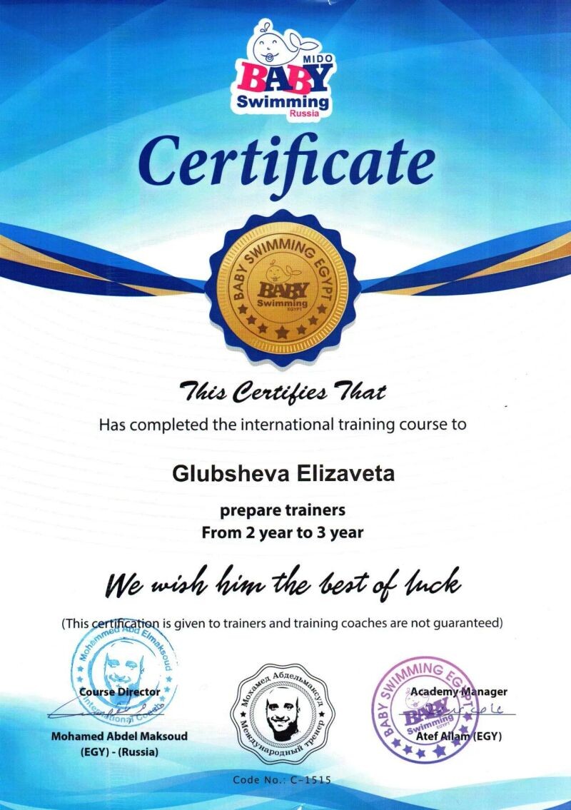 - Тренер грудничкового плавания, ванна — 3 года.
