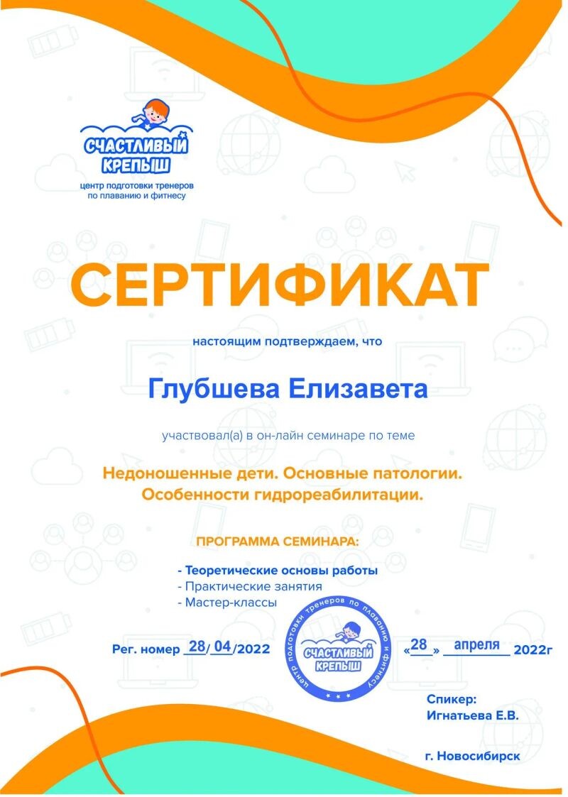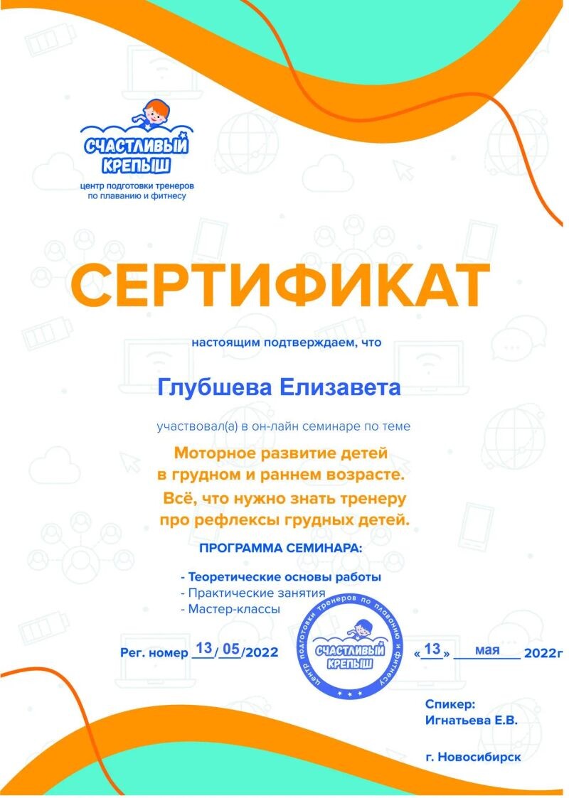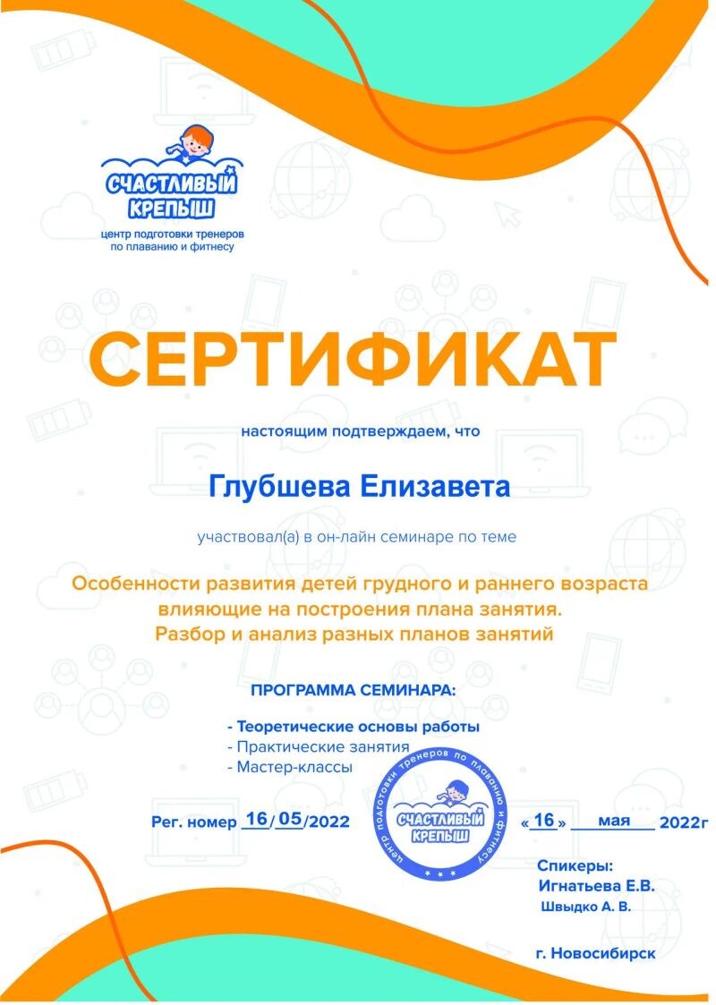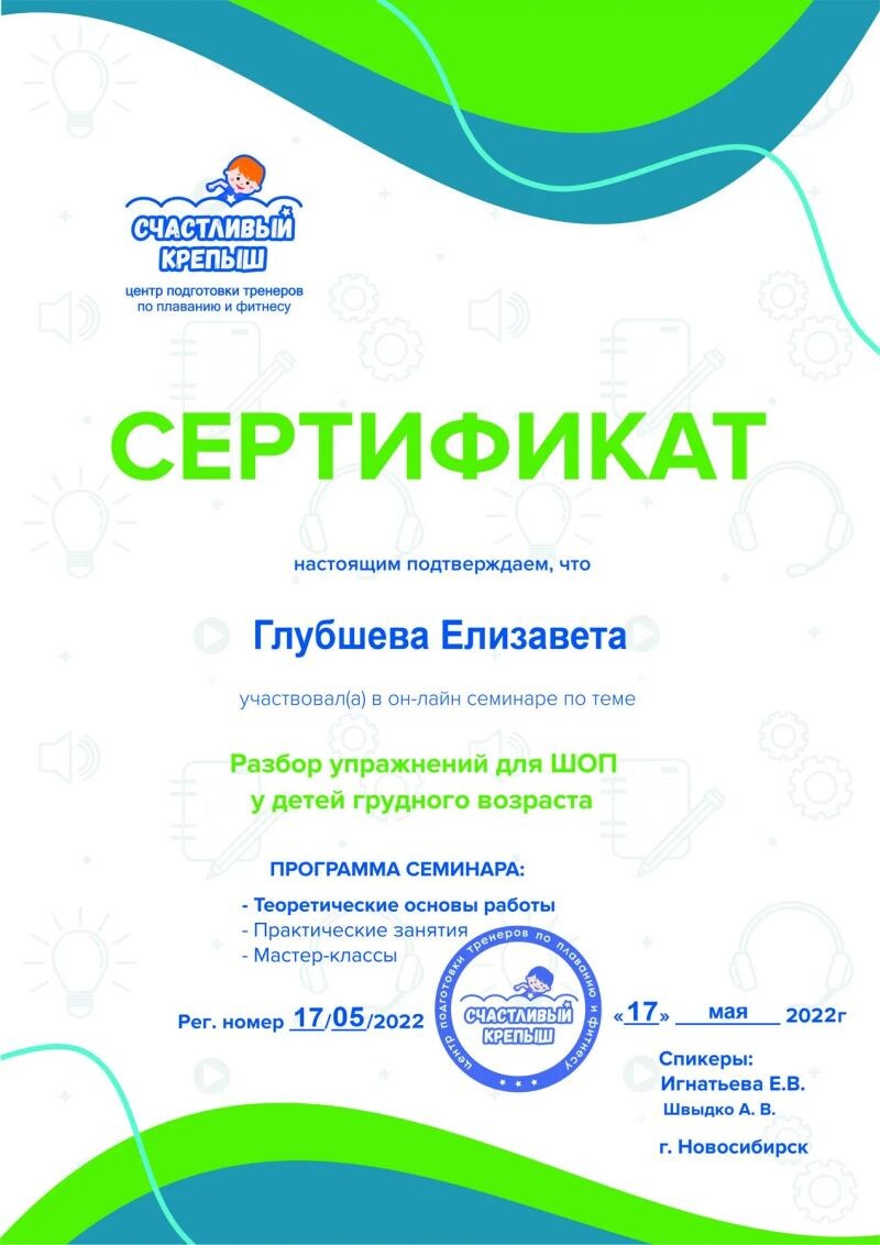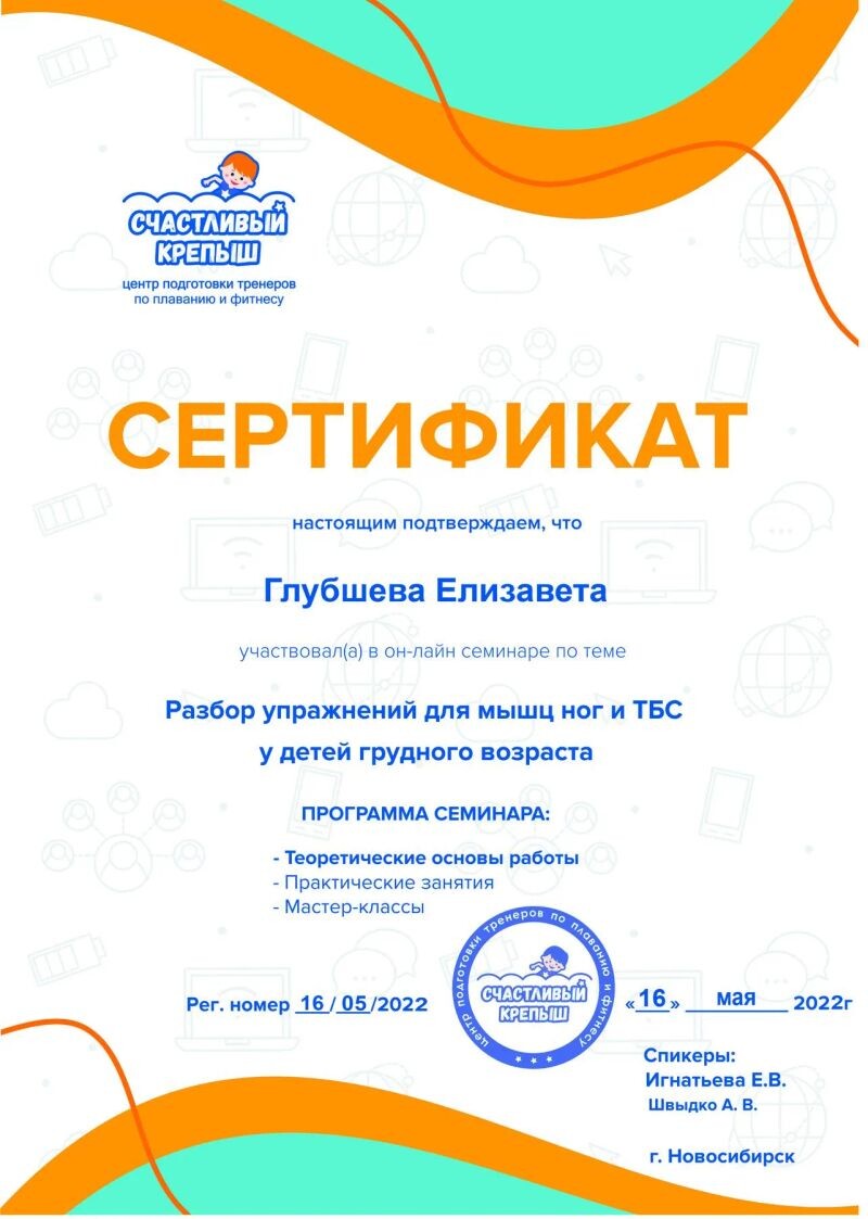 - Центр подготовки тренеров по плаванию и фитнесу «Счастливый крепыш», семинар «Разбор упражнений для пресса и спины у детей грудного возраста», 2022 г.