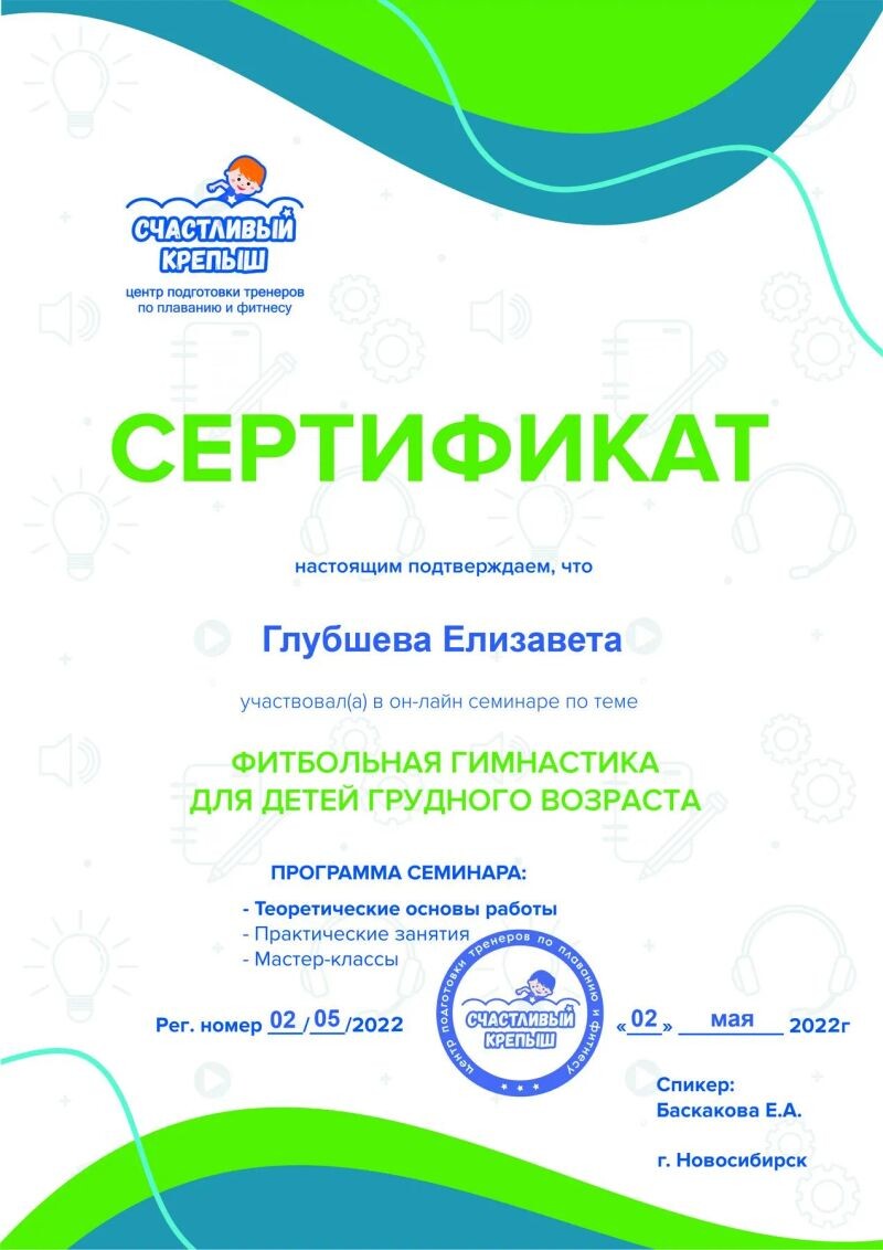 - Центр подготовки тренеров по плаванию и фитнесу «Счастливый крепыш», семинар «Фитбольная гимнастика для детей грудного возраста», 2022 г.