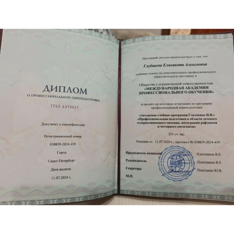 - ООО «Международная академия профессионального обучения», программа переподготовки «Профессиональная подготовка в области детского оздоравливающего массажа, интеграции рефлексов и моторного онтогенеза. Авторская учебная программа Гладченко И.В.», 2024 г.