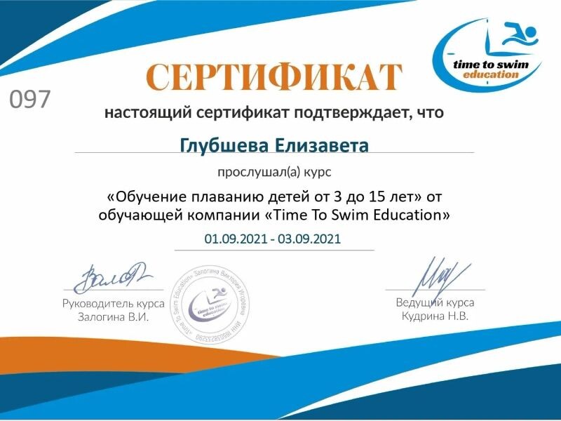 - Time To Swim Education, курс «Обучение плаванию детей от 3 до 15 лет», 2021 г.