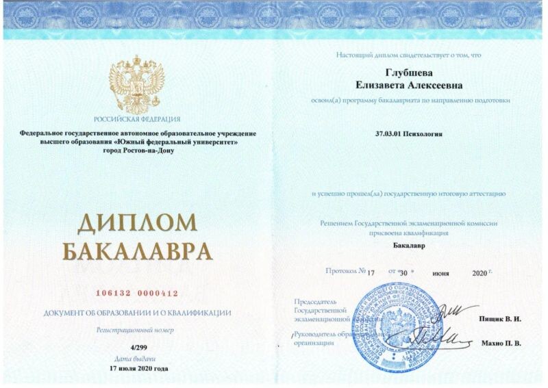 - Южный федеральный университет, психология, 2020 г.